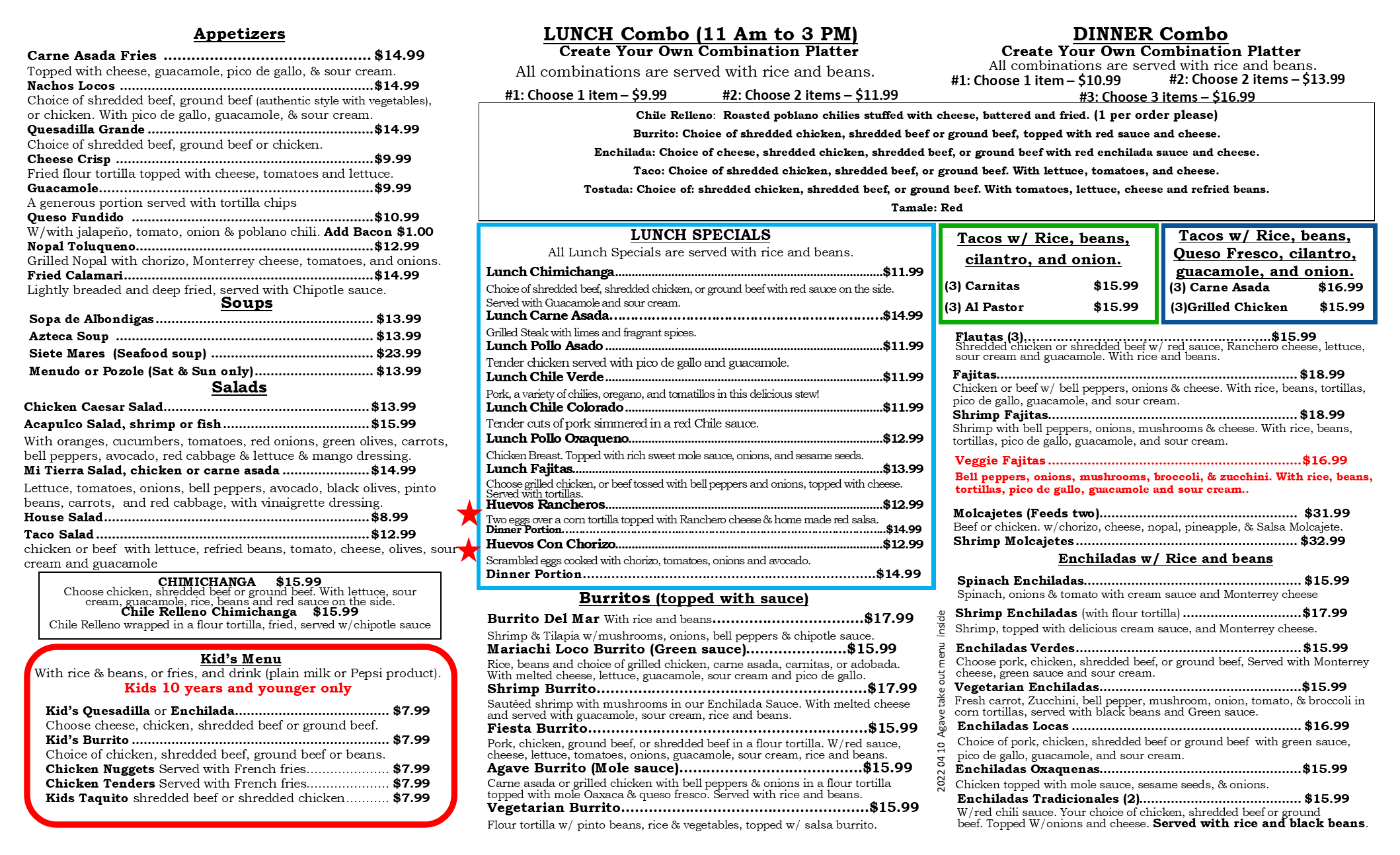 Here is our Dine-in Menu. Call now to place a take-out order. 928-774-1429Prices may be higher if you order through a delivery service. Agave Menu page 01 Agave Menu page 02
